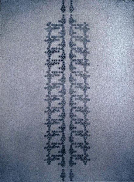 Oil, punctures, and iridescent stainless steel paint on paper