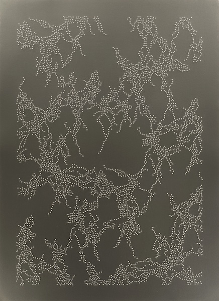 Punctures and iridescent stainless steel paint on 300-lb watercolor paper, lit from the sides