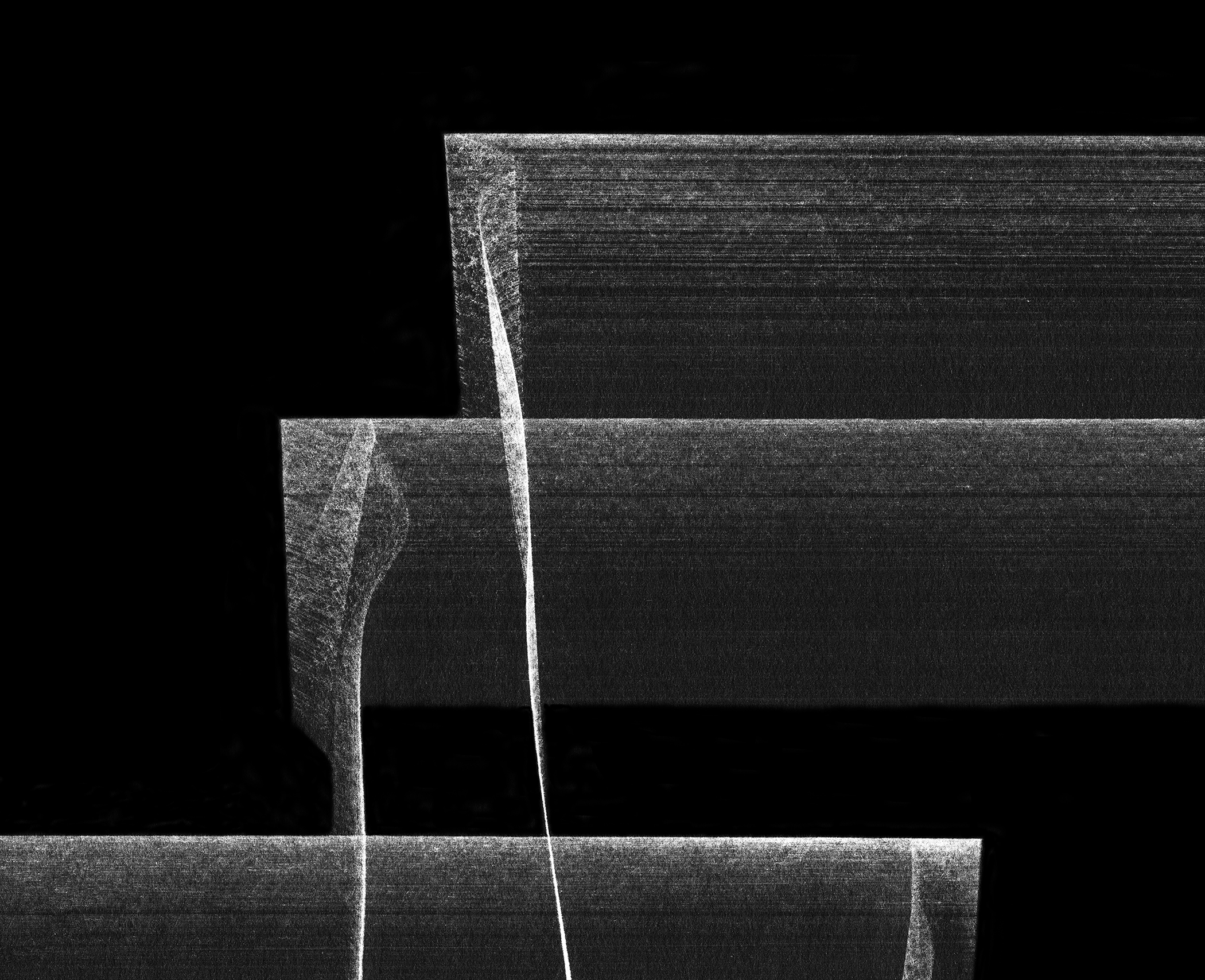 DETAIL: Never the Same River 15 Graphite drawing, scanned and laser-etched into black lucite and painted, dimensions variable. |