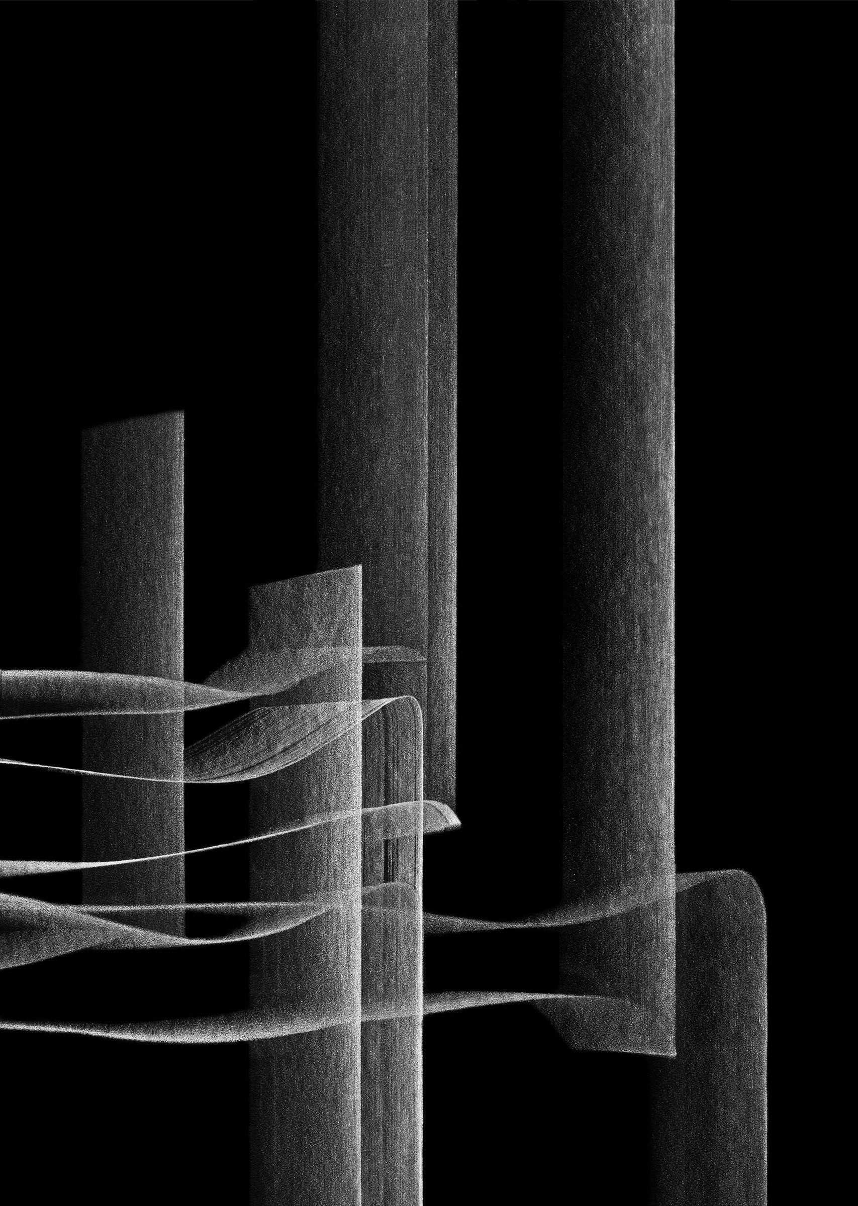 Never the Same River #17, 2018 Graphite drawing, scanned and laser-etched into black lucite and painted, dimensions variable. |