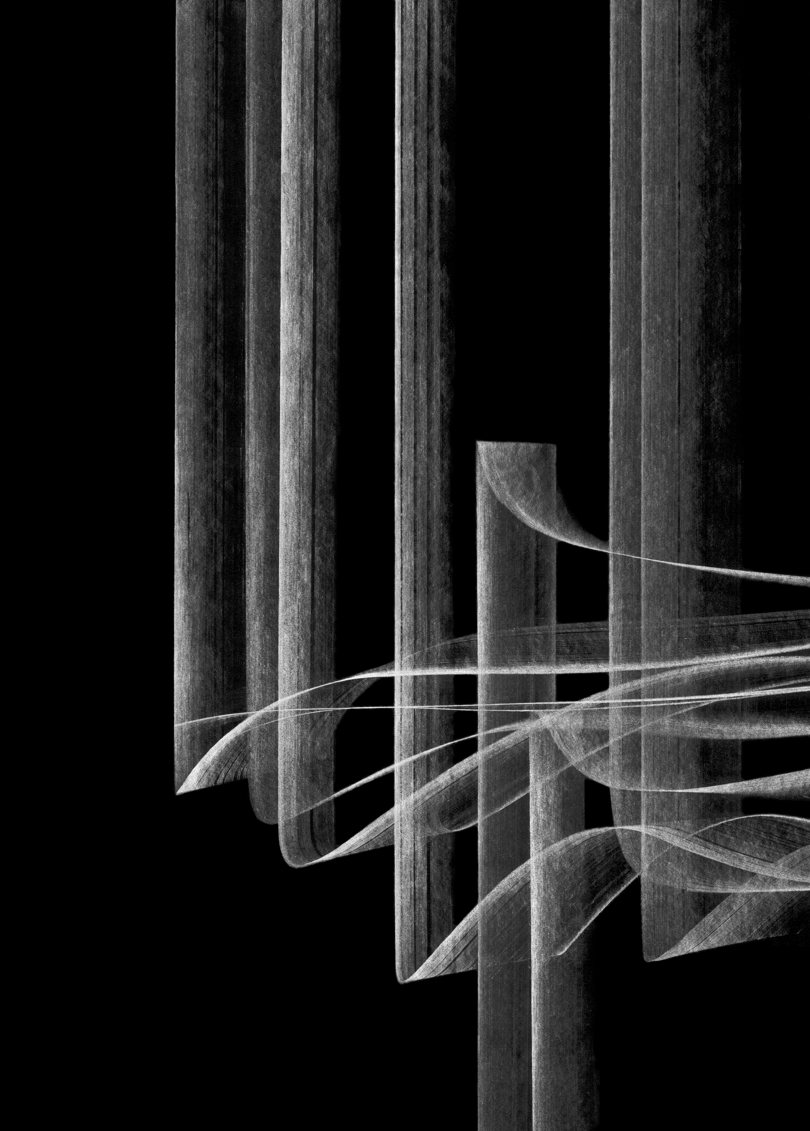 Never the Same River #19, 2018 Graphite drawing, scanned and laser-etched into black lucite and painted, dimensions variable. |